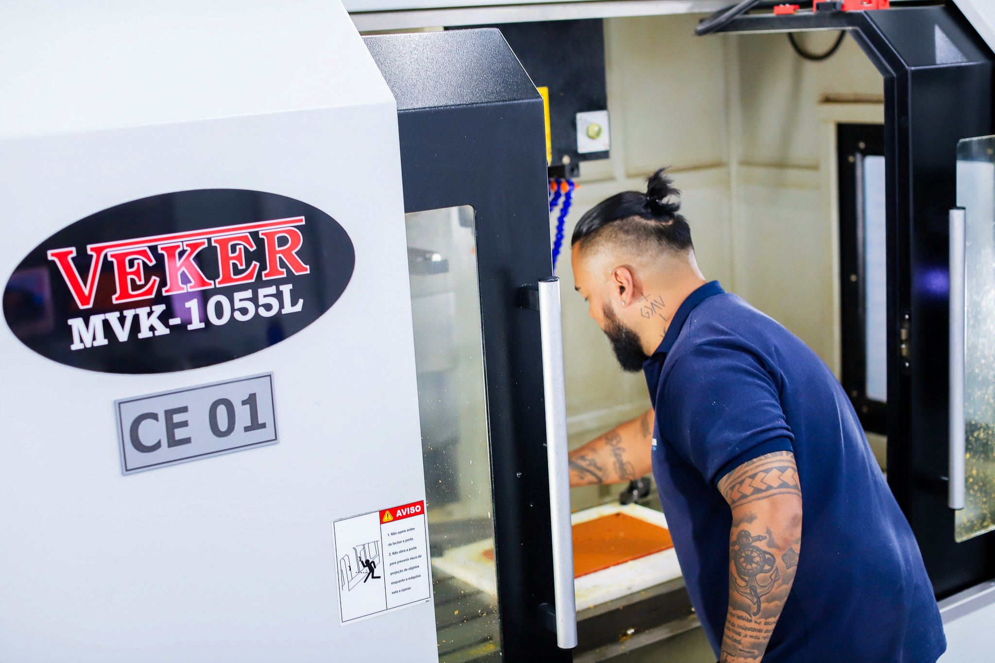 Centro completo com tornos, fresas e roteadores automáticos para usinagem de alta performance.